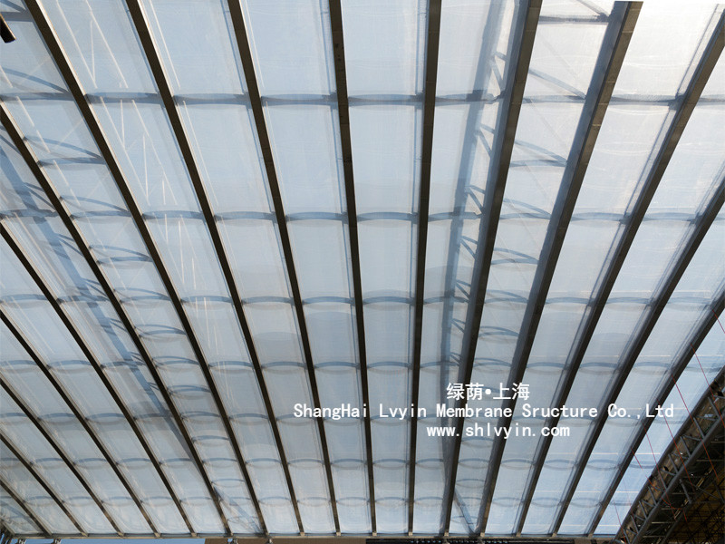 5)該材料不阻擋紫外線等光的透射,以保證建筑內部自然光線。根據位置和表面印刷的情況,ETFE膜的透光率可高達95%。通過表面印刷,該材料的半透明度可進一步降低到50%。