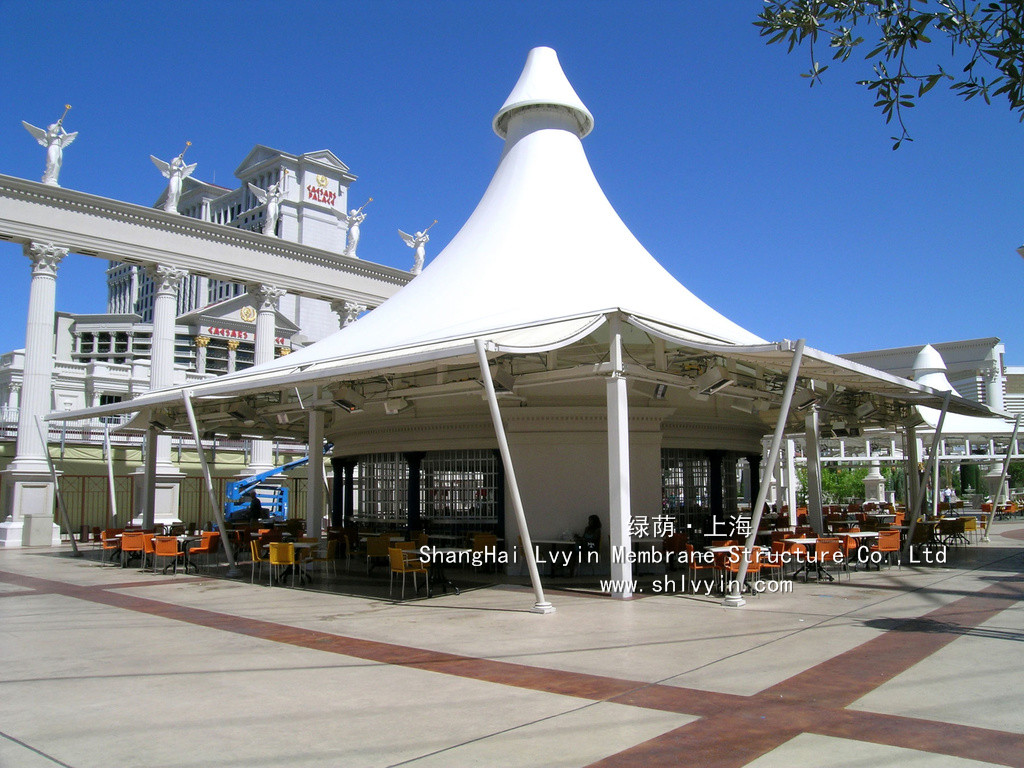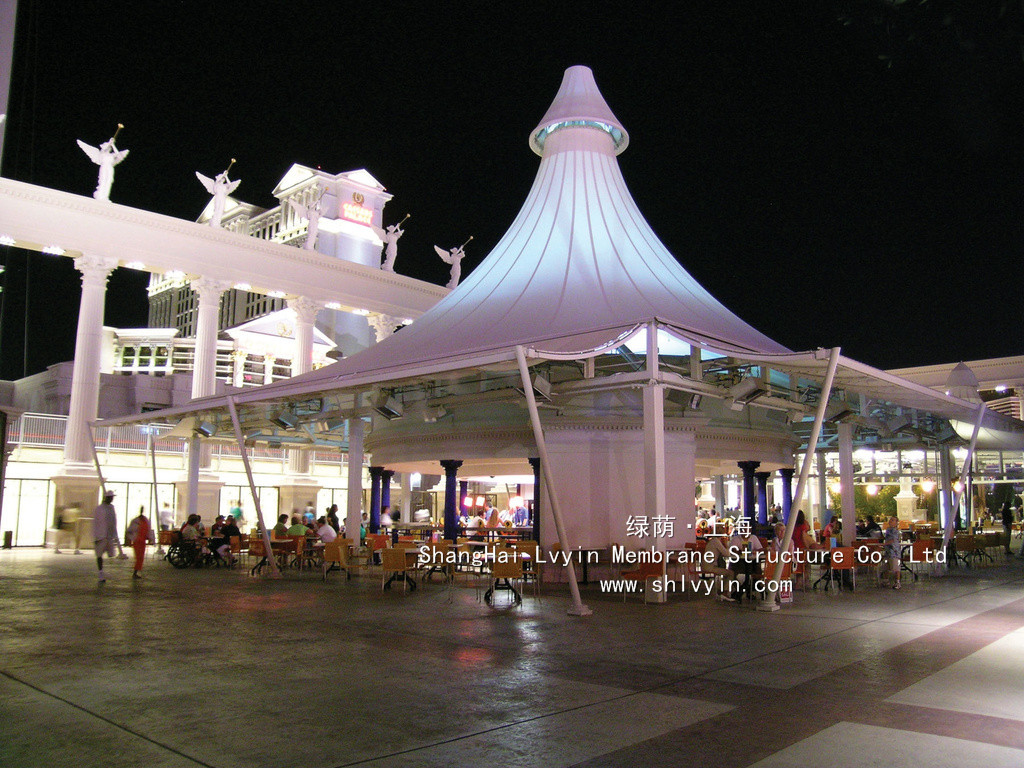 3. 永久性性膜材,使用年限30年以上。對太陽能的反射率高,所以熱吸收量很少。即使在夏季炎熱的日光的照射下室內也不會受太大影響。正是因為這種劃時代性的膜材料的發明,才使膜結構建筑從人們想象中的帳篷或臨時性建筑發展成現代化的永久性建筑。