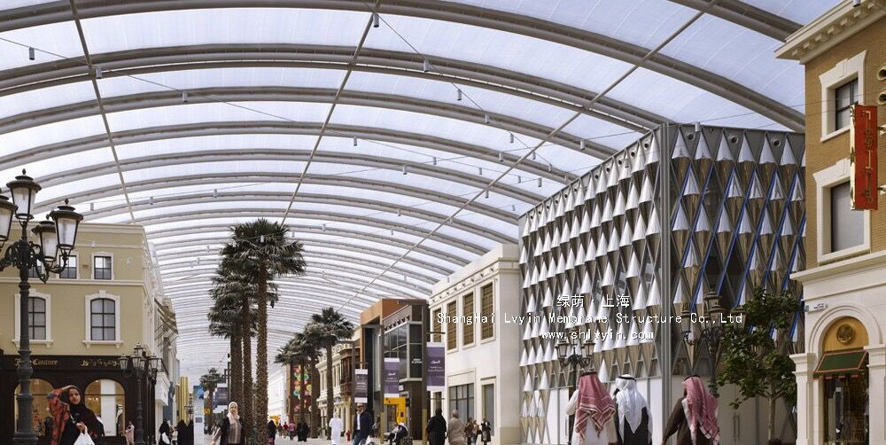 3. 永久性性膜材,使用年限30年以上。對太陽能的反射率高,所以熱吸收量很少。即使在夏季炎熱的日光的照射下室內也不會受太大影響。正是因為這種劃時代性的膜材料的發明,才使膜結構建筑從人們想象中的帳篷或臨時性建筑發展成現代化的永久性建筑。
